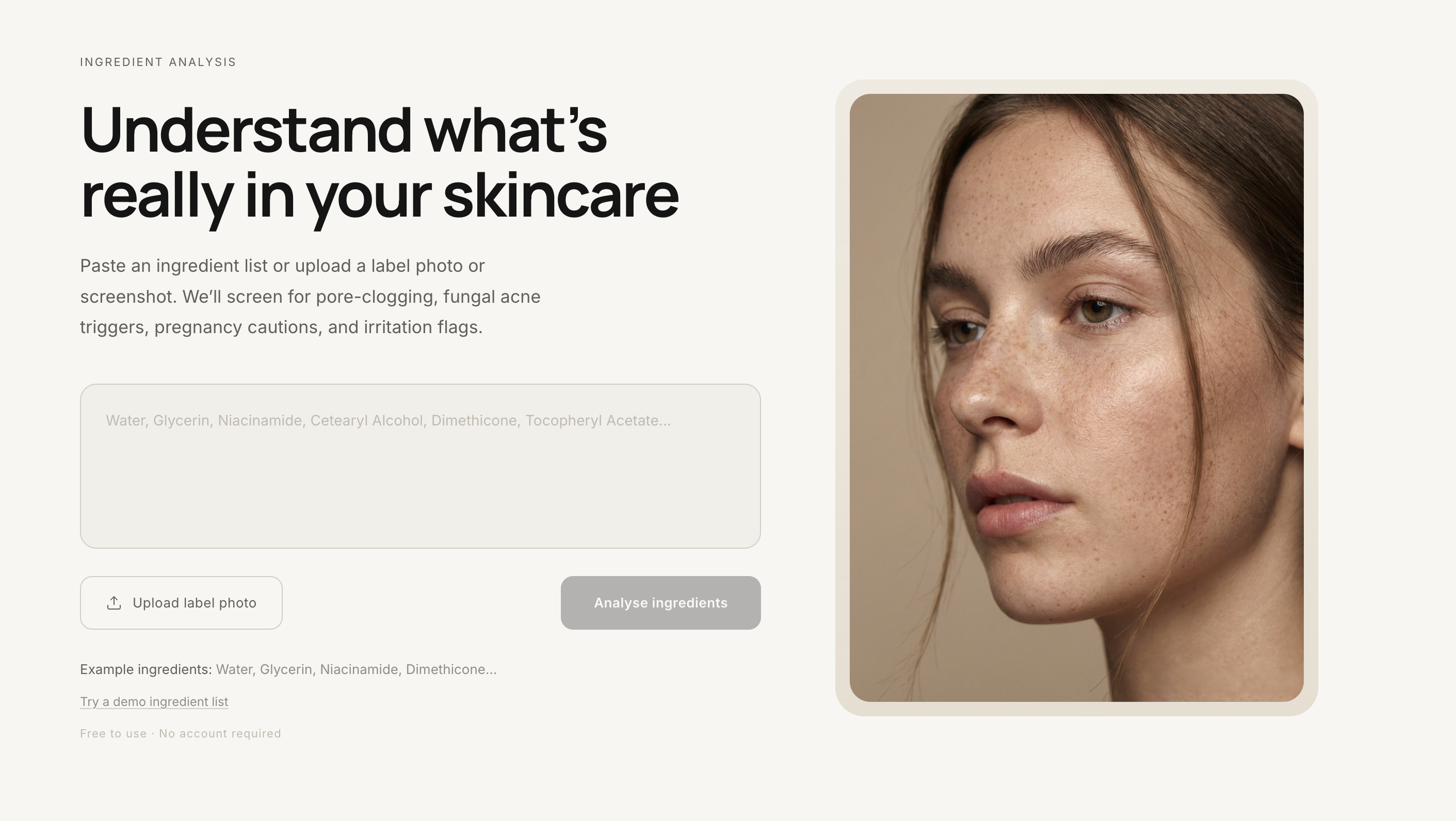 Paste an ingredient list or upload a label photo or screenshot. We’ll screen for pore-clogging, fungal acne triggers, pregnancy cautions, and irritation flags.
