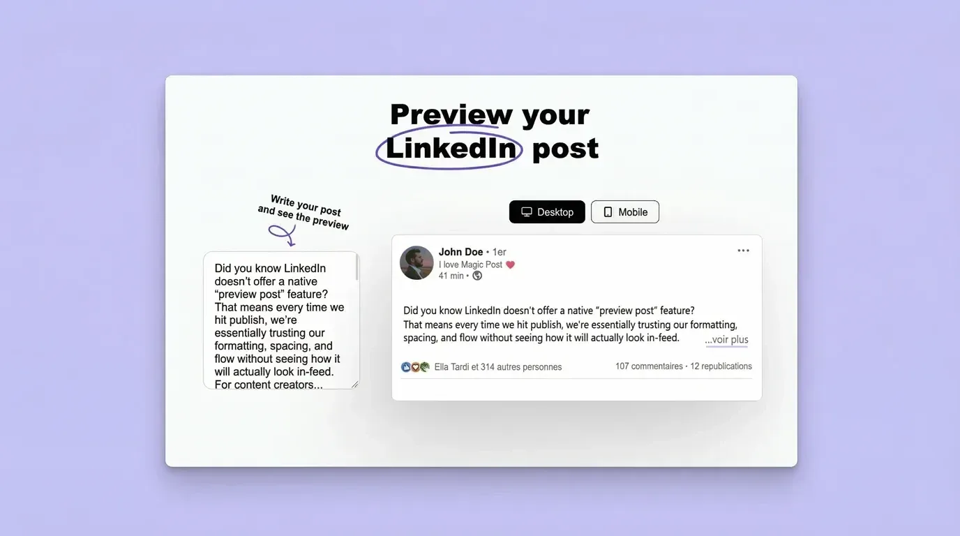 Engage directly from MagicPost. Create lists of profiles, prospects, partners, teammates, and more; automatically see their latest posts, all within MagicPost.
