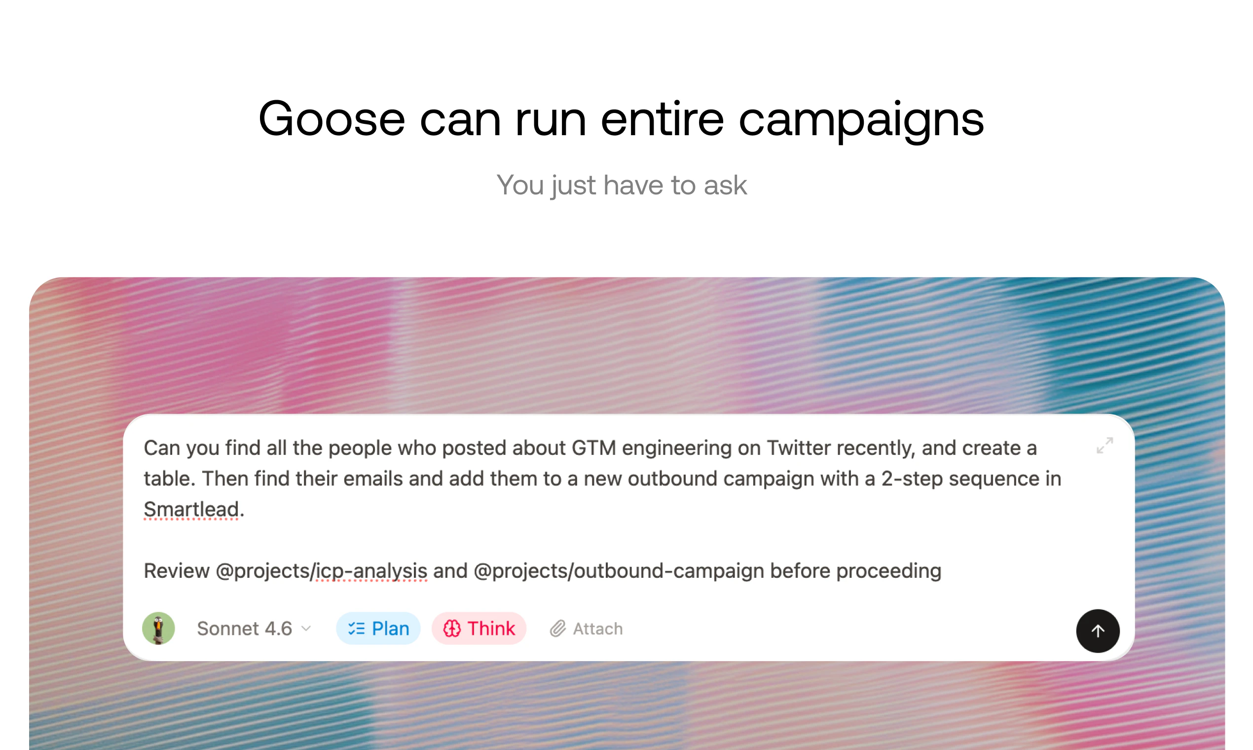 Goose is an AI coworker with its own computer, email, and memory. It does real GTM work – like run outbound campaigns, audit SEO, build lead lists, create content, and monitor competitors. Talk to Goose from Slack, email, iMessage, or the web app. It remembers your business context, learns your preferences, and gets better over time.