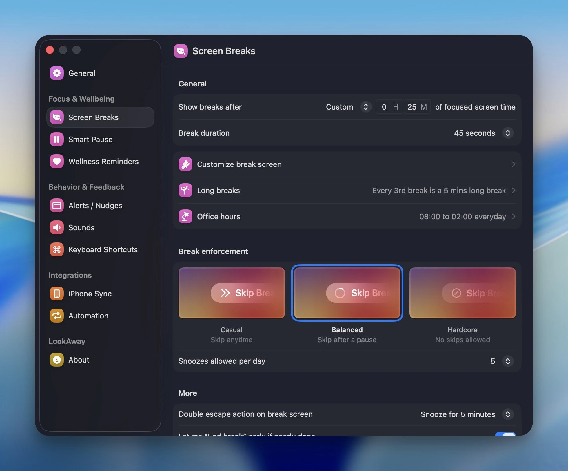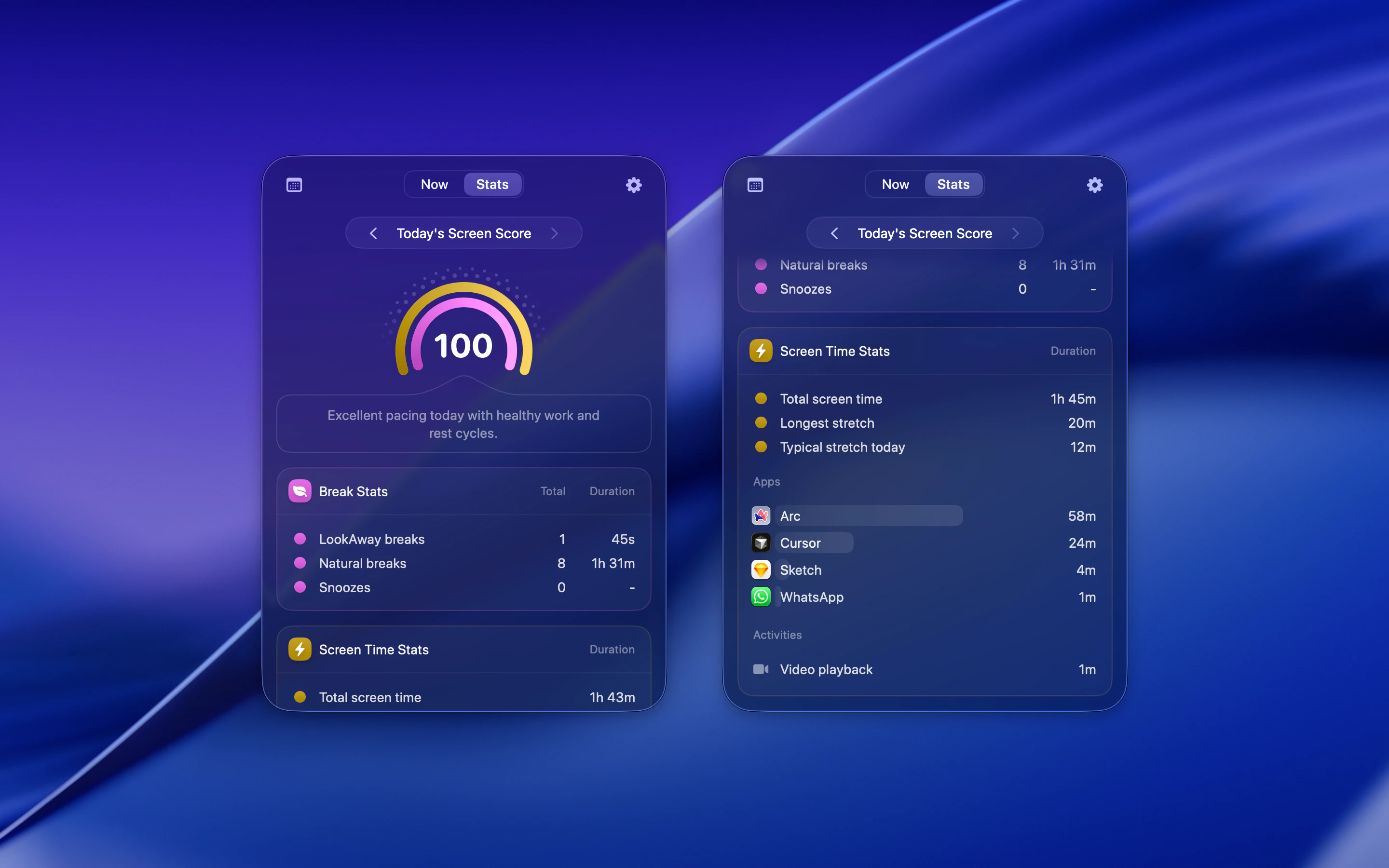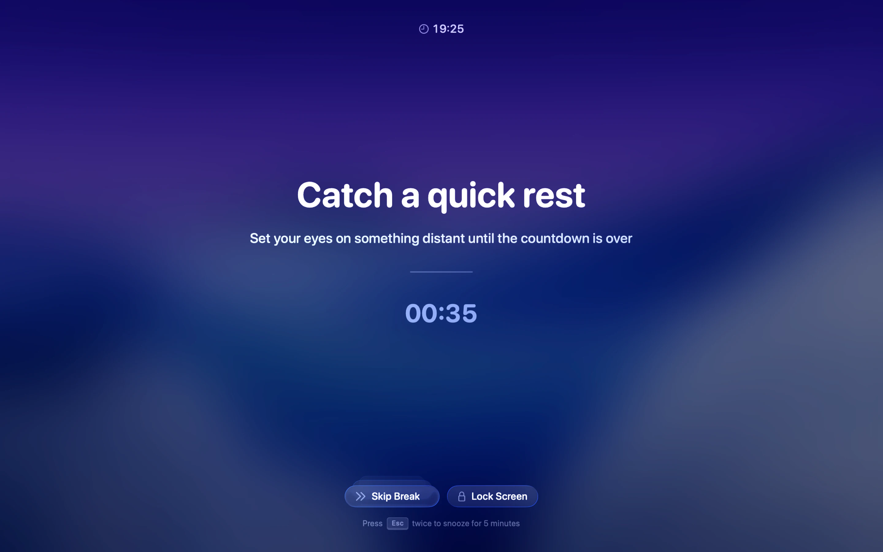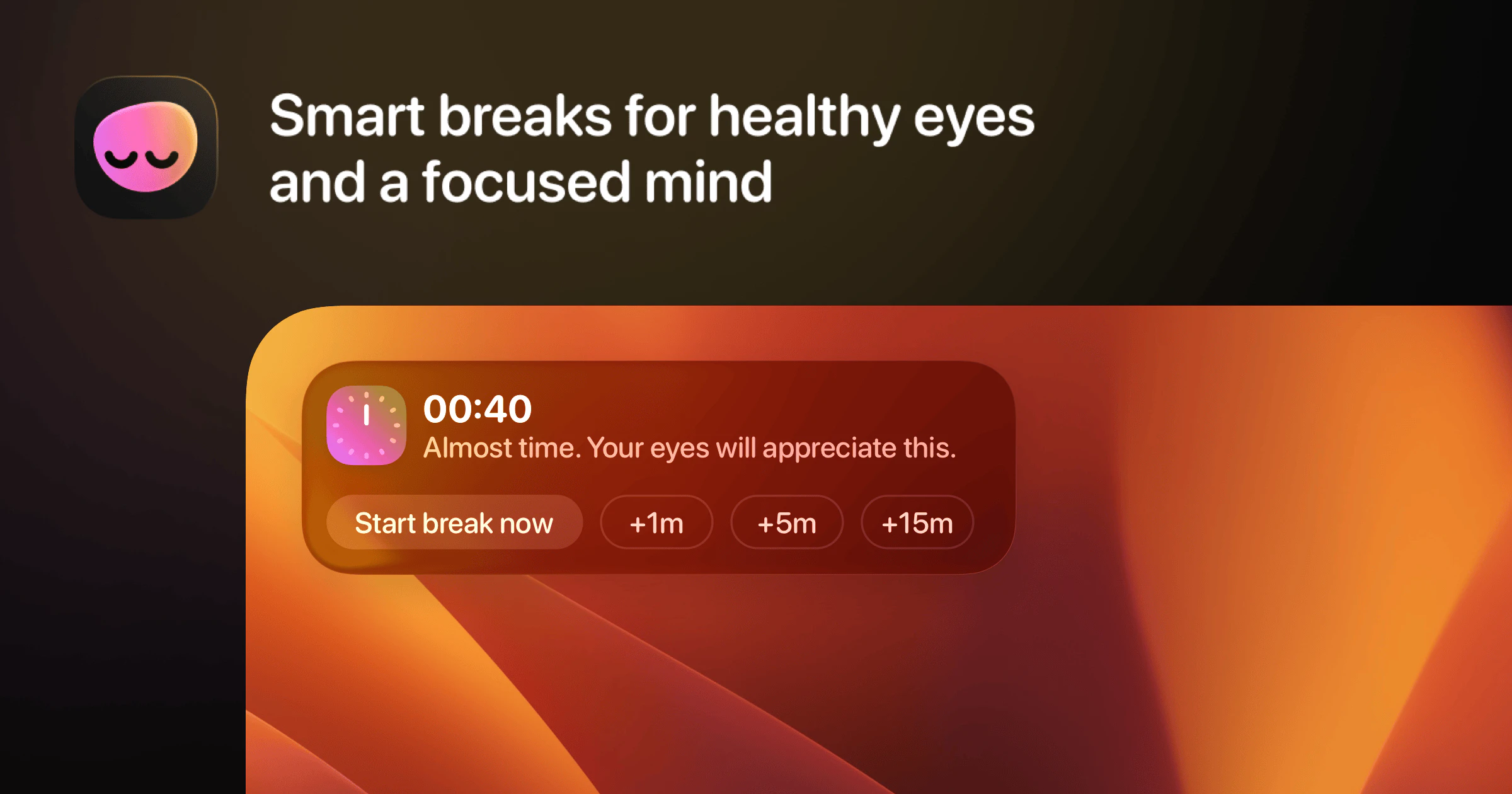 LookAway is a smart break reminder for Mac that helps reduce eye strain and screen fatigue. It combines break, blink, and posture reminders with context awareness and iPhone sync, so your breaks stay in sync across devices and never interrupt you at the wrong time.