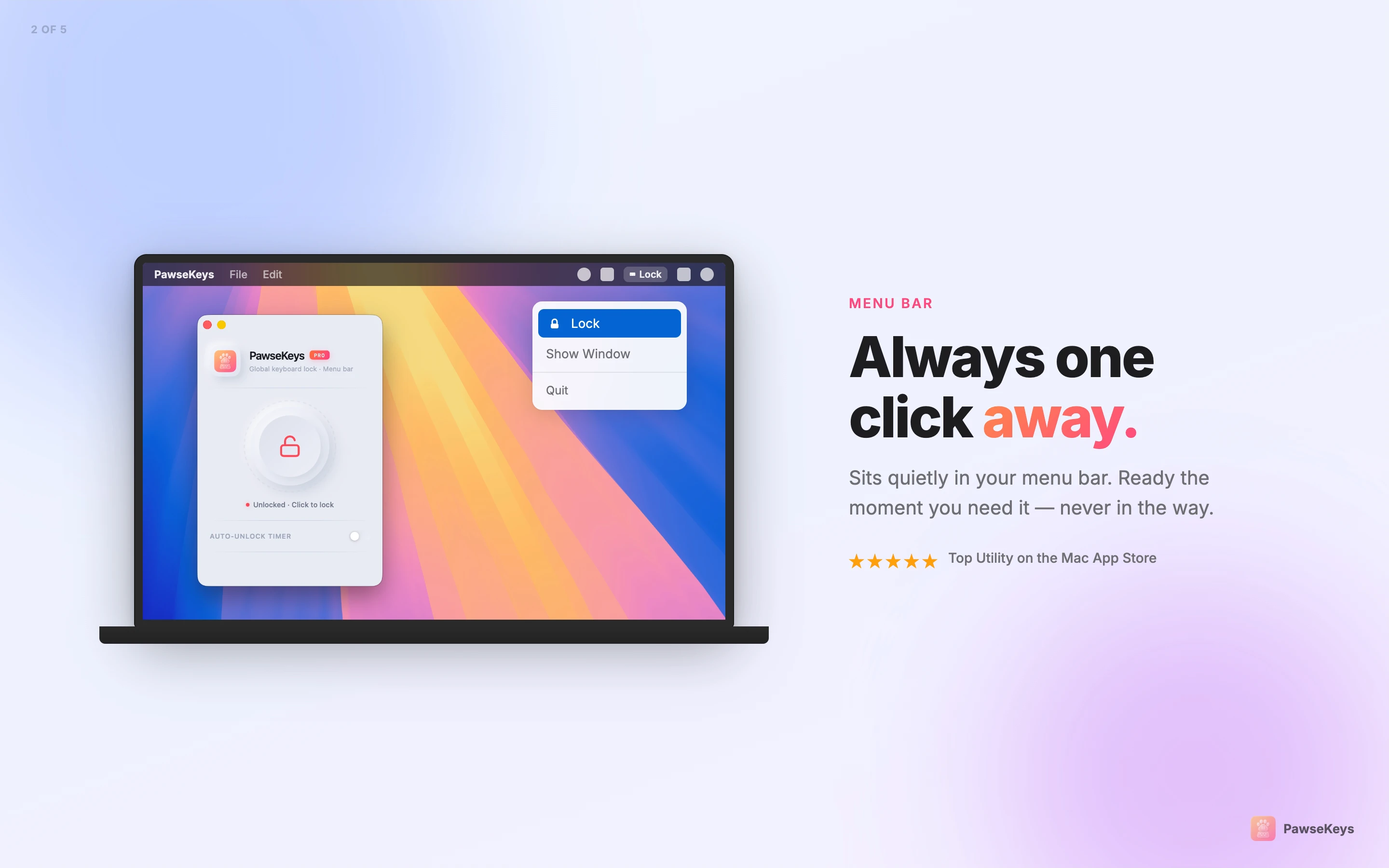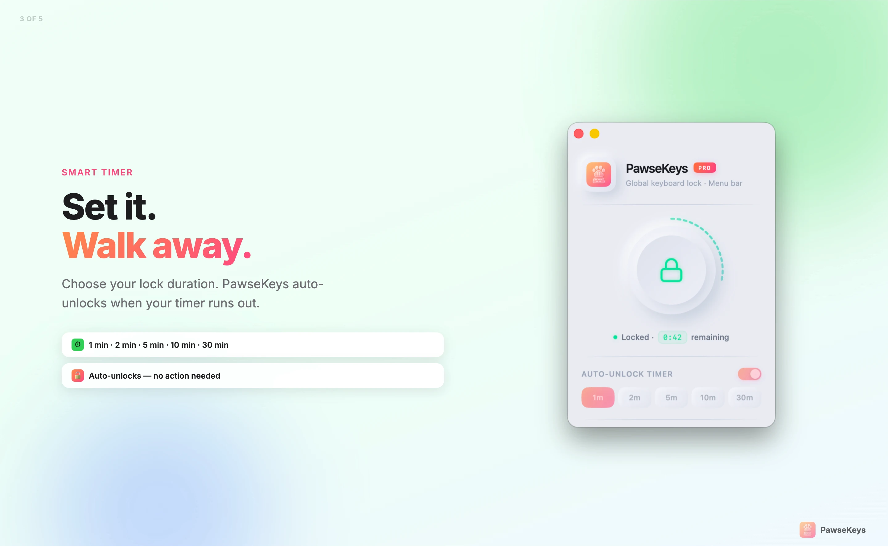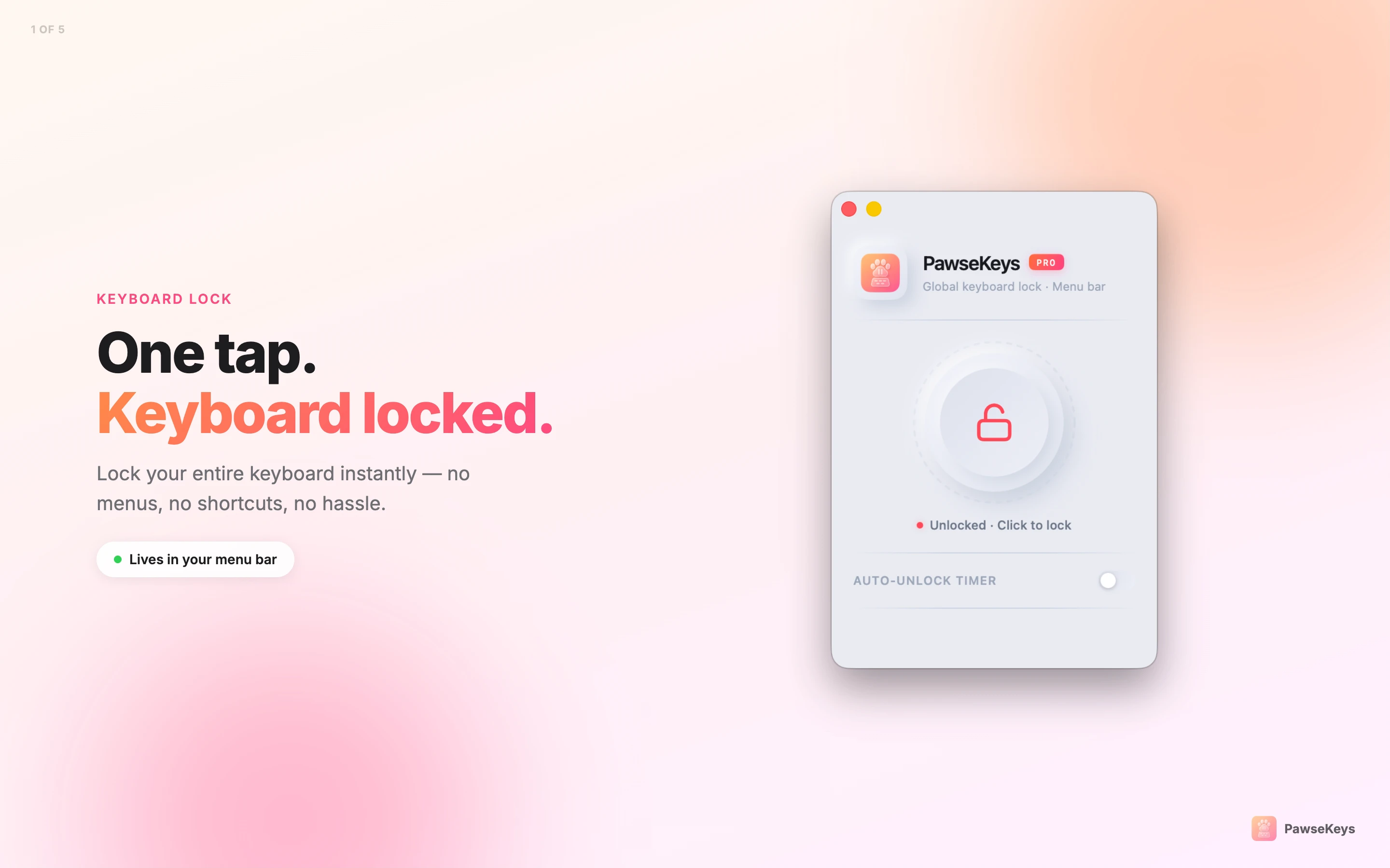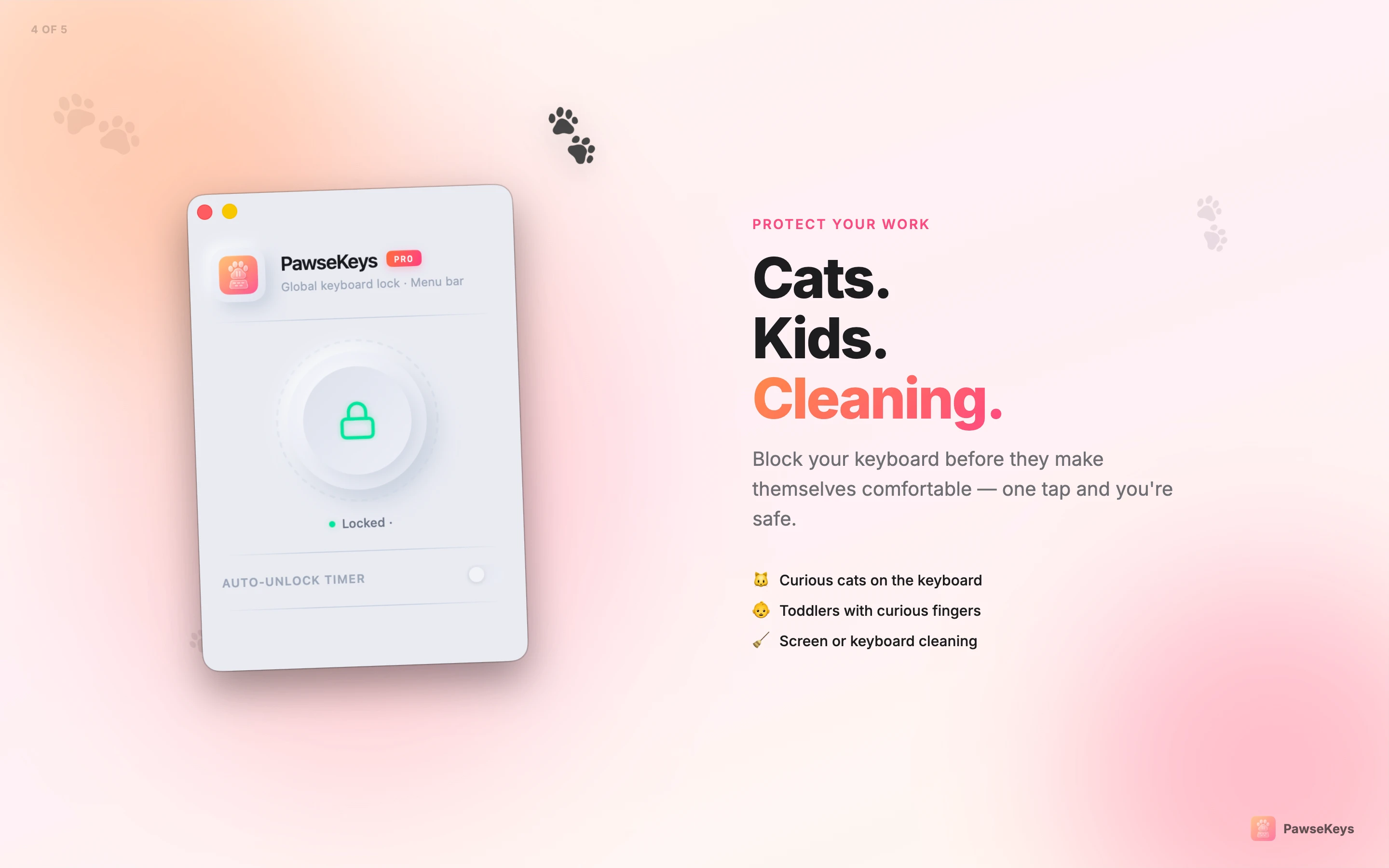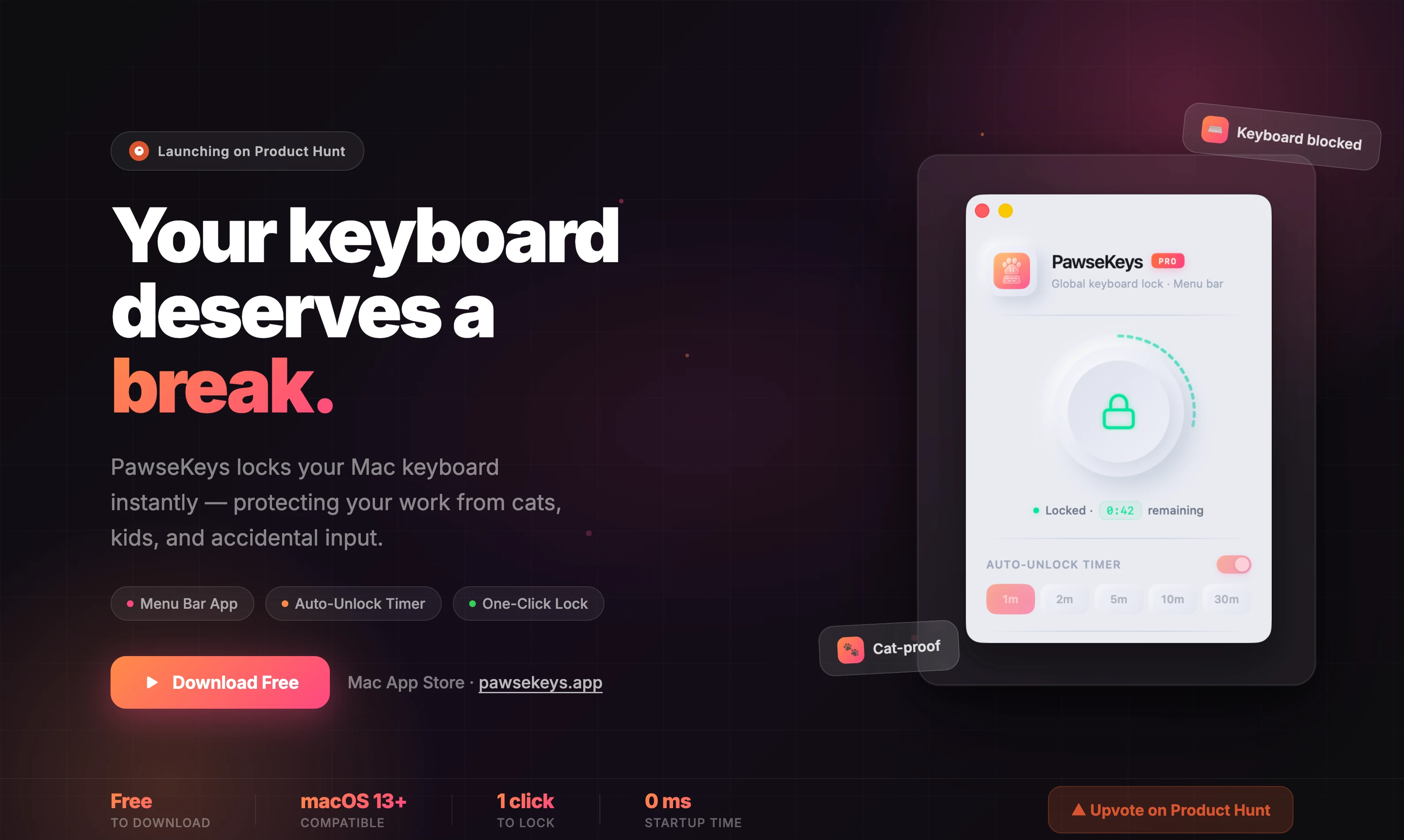 Home-office is great until a cat, dog, or toddler "helps" you type. PawseKeys is the ultimate shield for your Mac productivity. While it’s a powerful standalone locker, we’re adding a world-first factor: remote control via Apple Watch. The Watch companion app is currently in final review and will be released as a free update this week! Lock or unlock your Mac keyboard directly from your wrist. Perfect for stepping away from your desk or cleaning your setup. ⌚✨