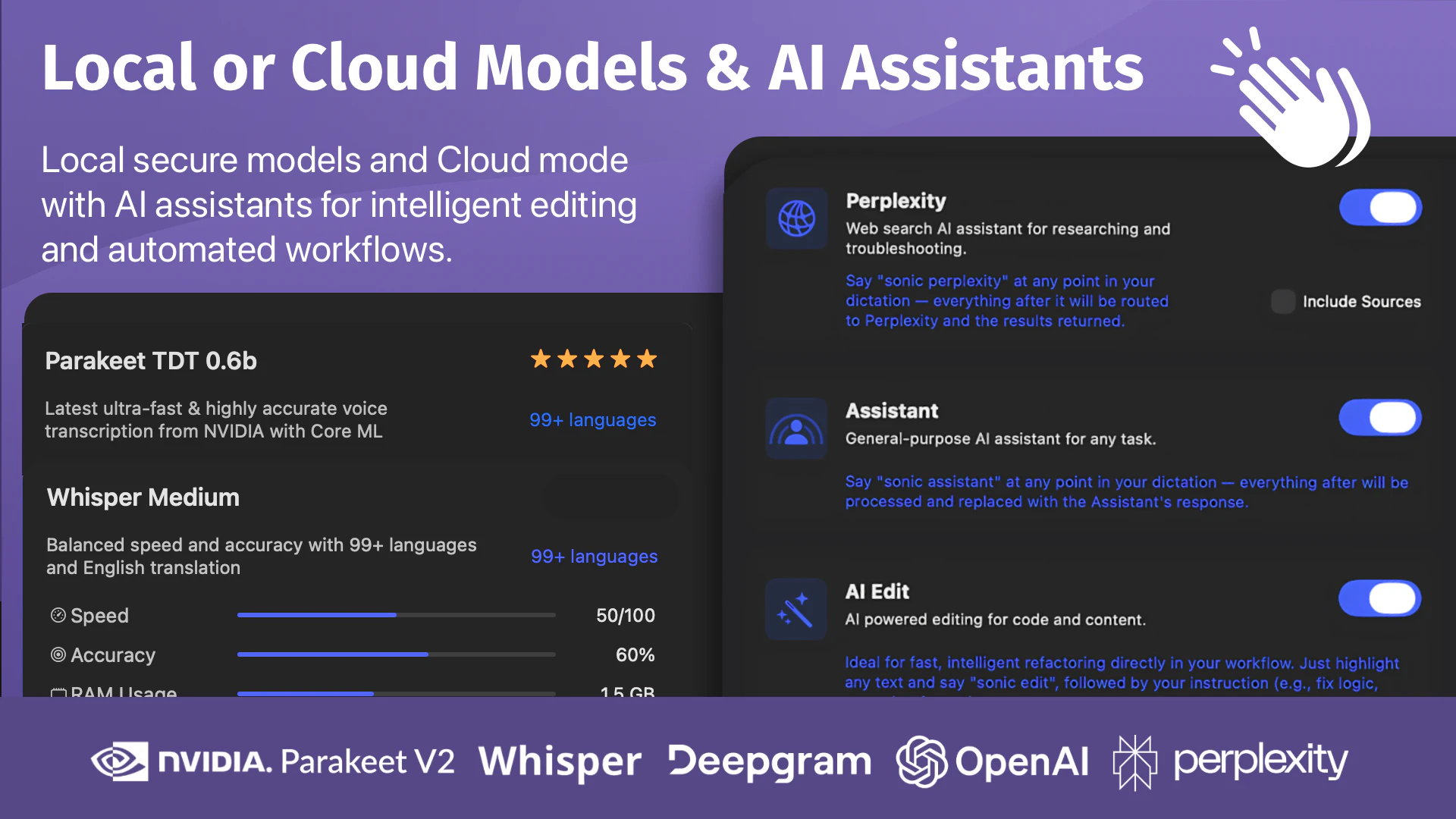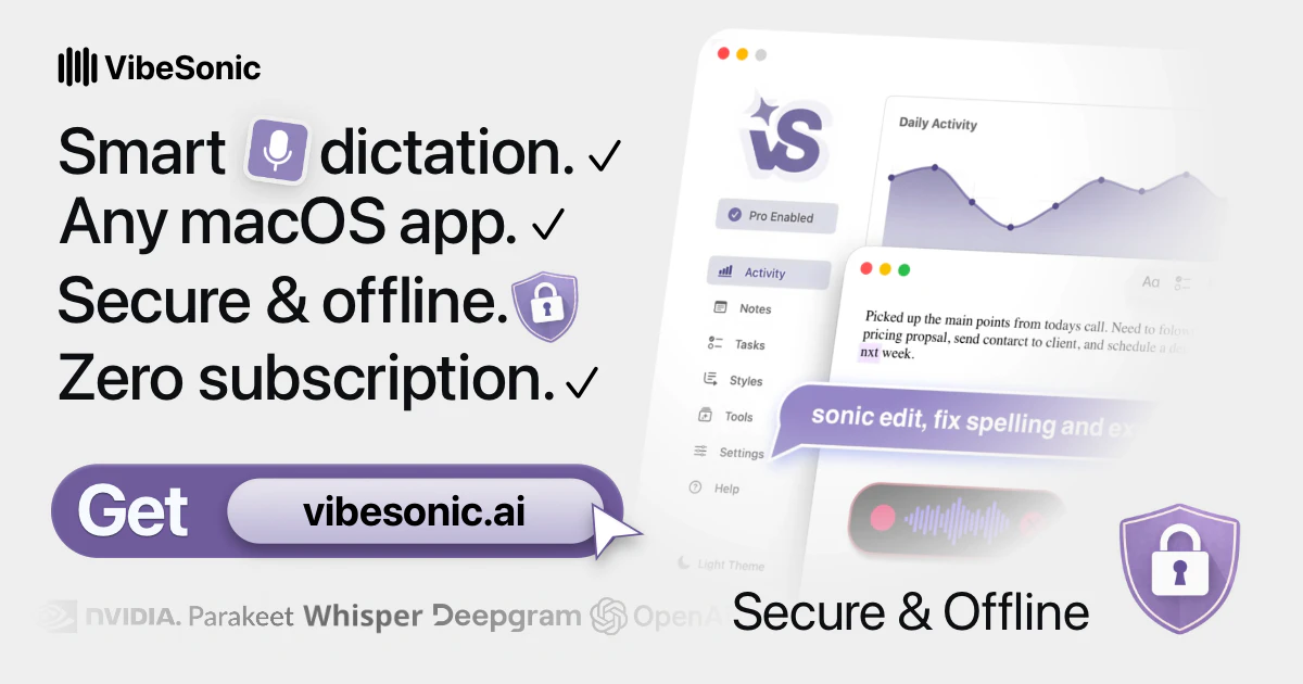 AI voice dictation that runs entirely on your Mac. No cloud, no subscription, no data leaving your device. On-device Whisper and NVIDIA Parakeet models work in any app — IDE, browser, email, wherever your cursor is. Beyond dictation: voice-powered notes, tasks, AI text commands, custom dictionaries, and web search via Perplexity. Optional BYOK cloud mode: bring your own OpenAI/Groq/Deepgram key, pay providers directly. Pro license from $19.95. One-time. Forever.