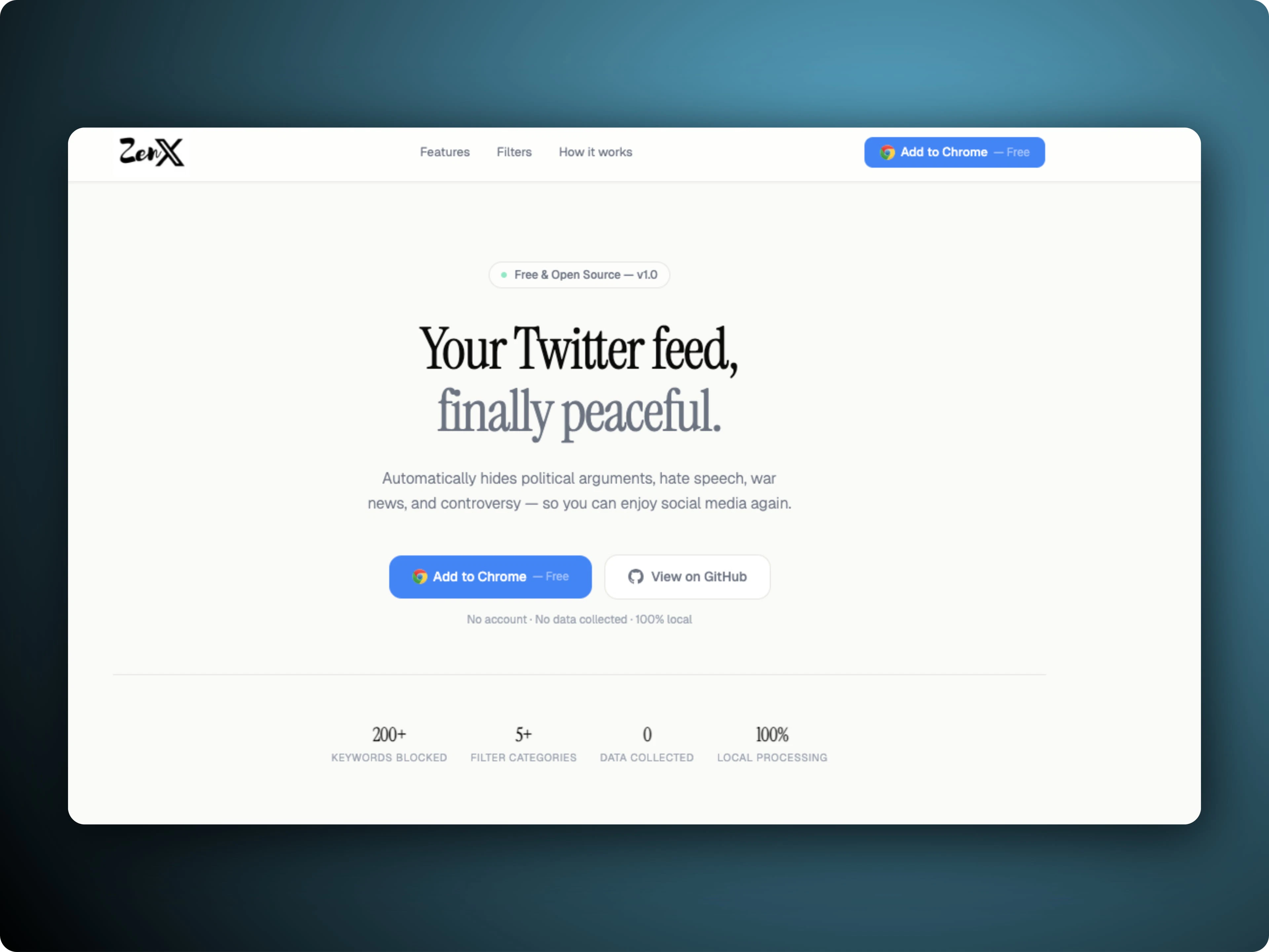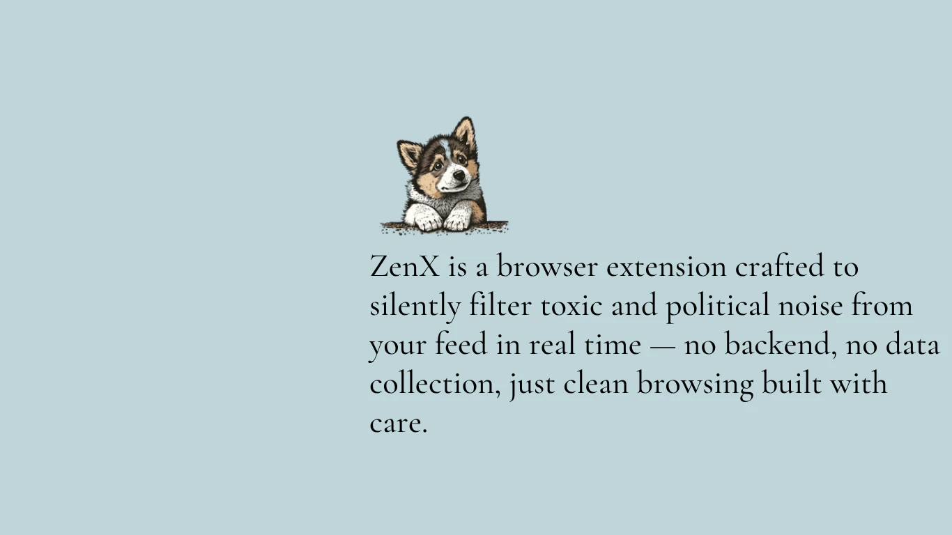 You open Twitter to see what people are building. You get war updates and election arguments instead. ZenX fixes that — it silently collapses toxic, political, and controversial tweets as you scroll. 100% local. No data collected. Free & open source. Chrome, Brave, Edge, Firefox.